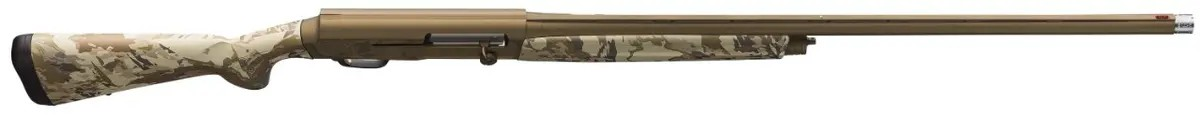 2025 SHOT Show Special Camo Patterns – Super reliable autoloading waterfowl hunting shotgun featuring Kinematic Drive recoil operation. Composite stock. Cerakote Burnt Bronze camo finish on receiver, Cerakote Burnt Bronze on the barrel. Oversized bolt release, extended Invector-DS Goose Band choke tubes and corrosion-resistant chrome bore. ABS case included.